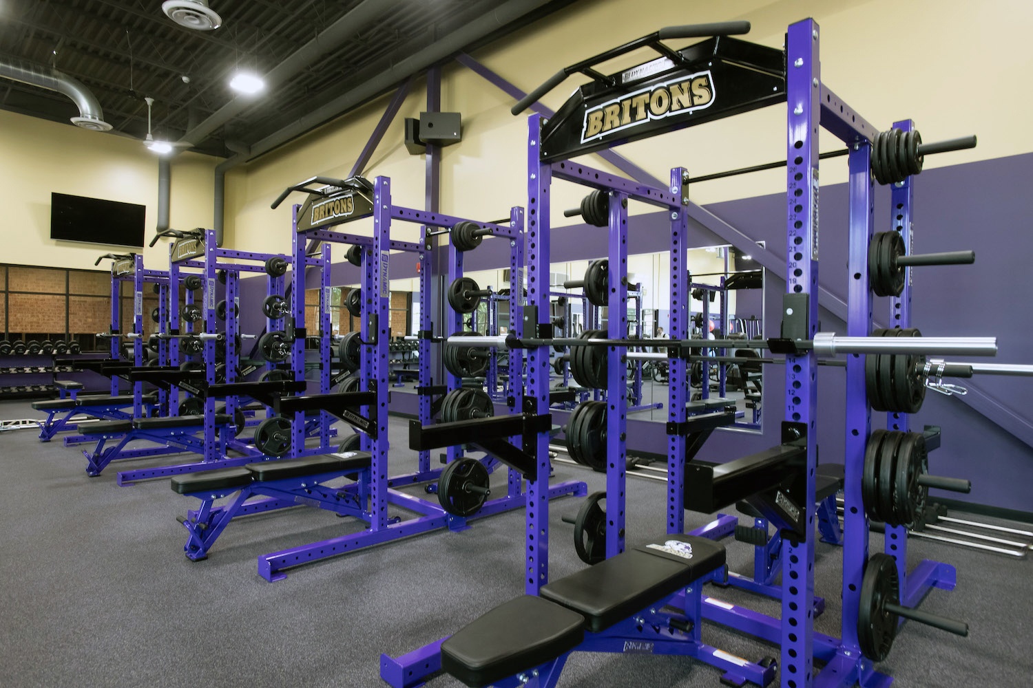 The weight room received new Olympic-style weightlifting equipment, new high-impact flooring, a new ceiling and fresh wall coverings complete with Britons athletic branding elements.