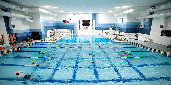 The facility’s highlight is the T-shaped pool, 25 yards by 25 meters. The shallow end of the pool has a depth of just over four feet, while the deep end of the pool measures 14 feet deep. The deep end houses two one-meter diving boards and one three meter board. The pool was updated with new starting blocks, diving boards, and lane markers in 1991. The diving boards are made by Duraflex and comply with NCAA regulations.