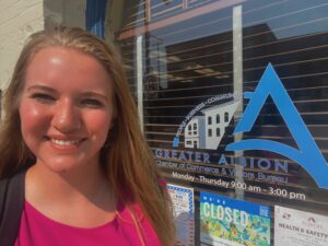 Miley Phillips ‘25 spent her summer interning for the Greater Albion Chamber of Commerce. Her internship had her not only working alongside the executive director on day to day operations, but also planning and marketing events that happen in Albion. This summer, Miley helped to deliver on events in the city for summer festivities, such as the annual fireworks display, and has been working on business representation for Festival of the Forks. Miley’s impact was not only on the community, but in her own growth as well. During her internship, Miley has been able to work hands-on practicing community development skills, engaging with the work businesses are doing in the Albion area, and advocating for business representation and community partnerships.