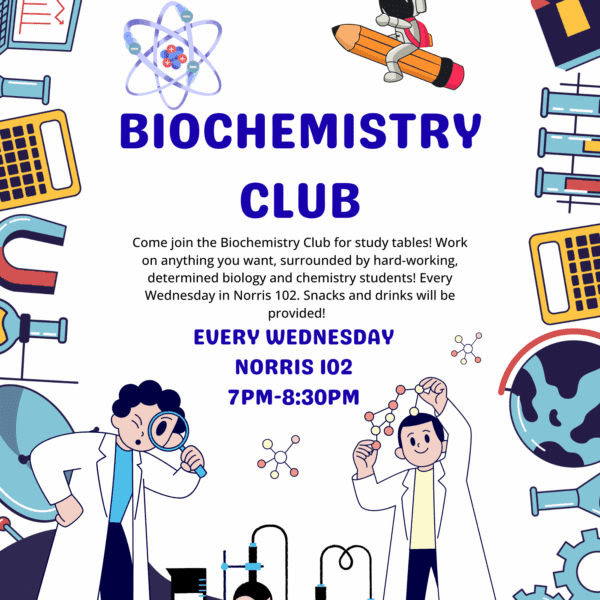 Join the Biochemistry Club for study tables! Work on anything you want, surrounded by hard-working, determined biology and chemistry students!…