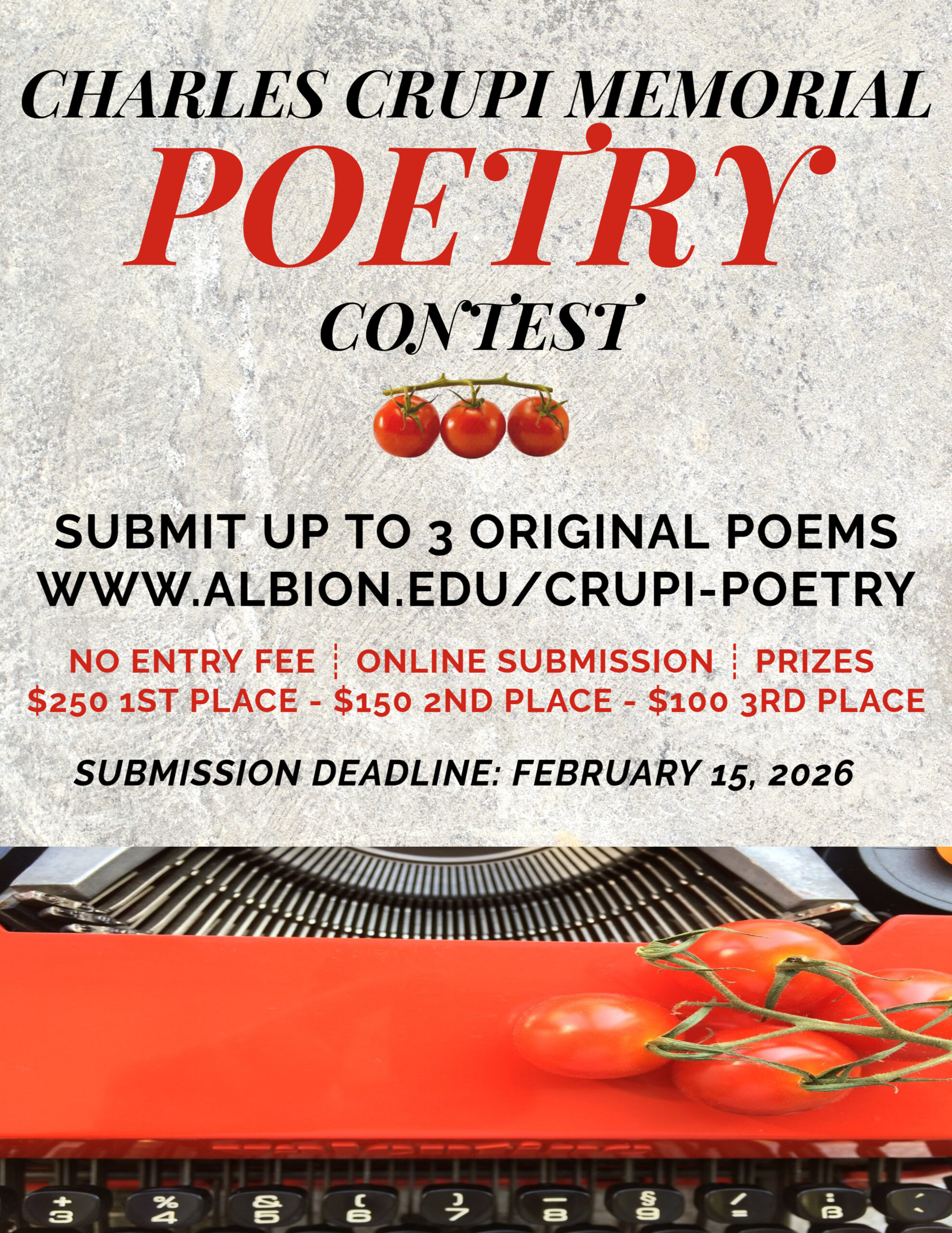 Albion College sponsors an annual poetry contest for high school students in Michigan. The contest is dedicated to Charles Crupi, a beloved English professor at Albion who passed away in 2009. Professor Crupi believed that language matters, that poems matter, that students matter—and that is precisely what this contest is about: language, poems, students. All Michigan high school students are eligible to enter. Winners will receive cash prizes ($250, $150, and $100 for the top three entries), and their poems will be published in our national undergraduate journal, The Albion Review. There is no cost to enter. All submissions should be sent in via Submittable.
