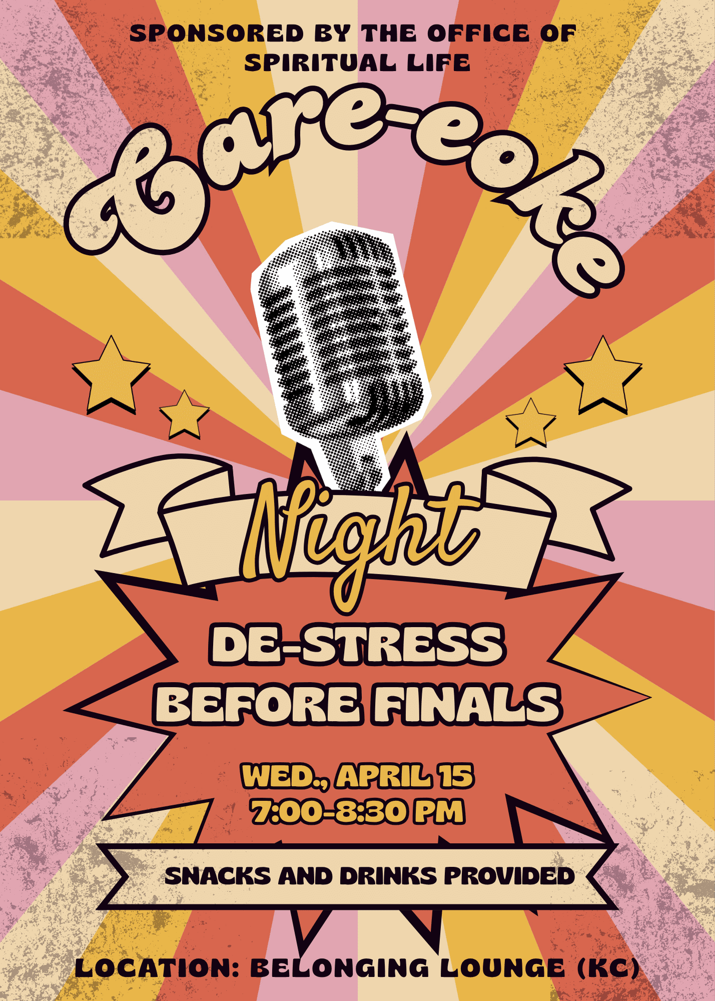 Join Spiritual Life for ‘Care-eoke’ on Wednesday, April 15th from 7:00-8:30 p.m. in the Belonging Lounge to sing your stress away before finals! Snacks and drinks will be provided.