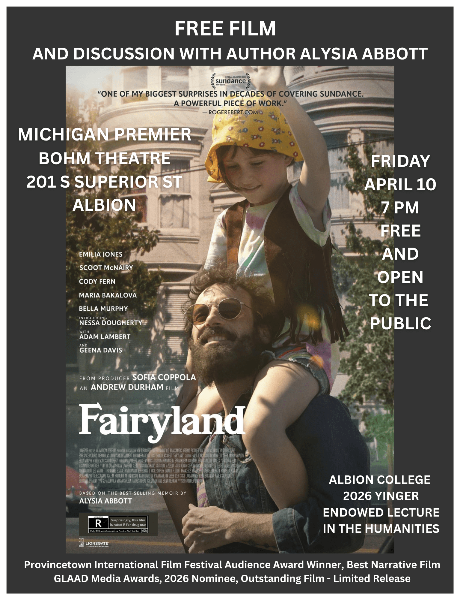 Albion College’s History department, in conjunction with the college’s 2026 Yinger Endowed Lecture in the Humanities, welcomes Alysia Abbott to Albion College and the Bohm Theatre for the Michigan premier of Fairyland, Friday, April 10th, at 7:00 pm.