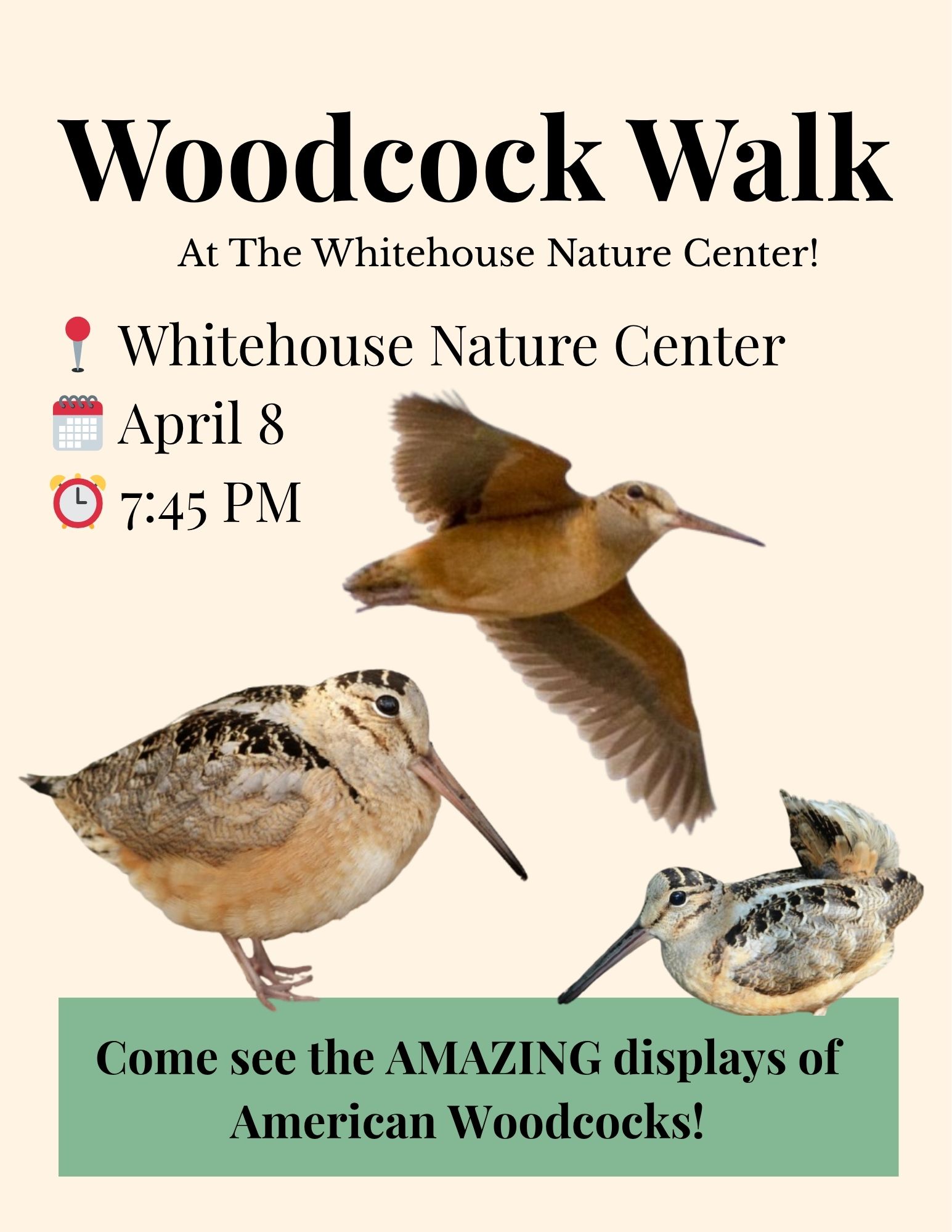 Meet us at the Whitehouse Nature Center and take a walk with ornithologist Dr Joanna Sblendorio for a chance to observe the sky dance performed by the male American Woodcock.