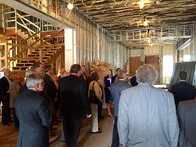 Members of Albion College’s Board of Trustees, including U.S. District Court Judge Thomas Ludington, ’76 (bottom left), got a peek inside the 101 N. Superior project on May 12, the day of the hotel groundbreaking just two blocks south.