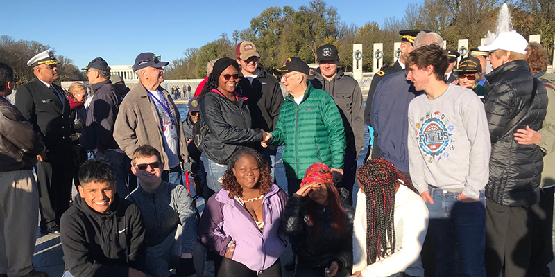 The First World War, the “war to end all wars,” fell short of that goal, and World War II became the war to save civilization. As our First-Year Seminar students approached the World War II Memorial on the National Mall, we spotted a group of veterans, representing World War II, the Korean War and the Vietnam War. Embracing our students, the veterans were eager to share life lessons with a younger generation. Notable among our new friends was 98-year-old Euel Akins from Savannah, Georgia, who had served in the fabled Tenth Mountain Division in the Apennines Mountains and Po Valley in Italy. Our students also had memorable conversations with Korean and Vietnam War veterans.