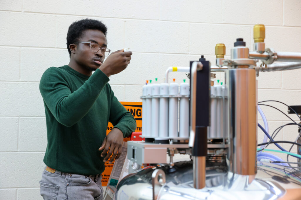 During the week, Jeremiah shuffles between the advanced synthetic lab on the third floor of the Science Complex and the math lounge on the second floor as he works on reactions or other projects. A good day, he says, is having up to five hours of focused lab time—no small task for any student, let alone a student with Jeremiah’s packed schedule.