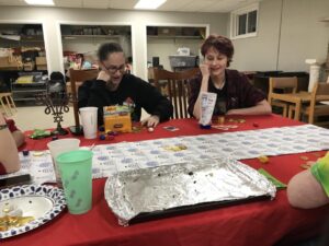 Hillel students playing dreidel after eating latkes at winter 2023 Hanukkah celebration